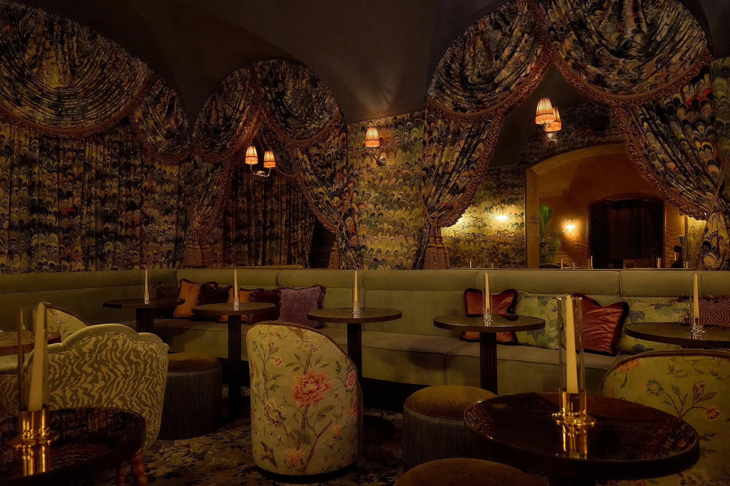 Materiality is central to the identity of Le Fou. Silk, mohair velvet, natural stone and patinated metal surfaces were selected for their tactile qualities and their ability to age gracefully. The interior was intentionally designed to develop character over time — fabrics soften, metals patinate, and surfaces gain depth. Luxury here is defined by substance and longevity rather than polish.